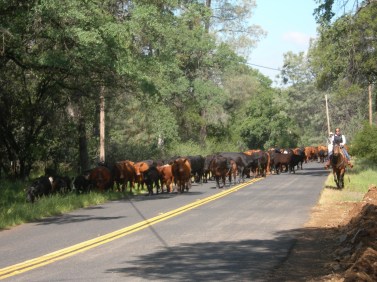 I have mentioned the drive before; it is an institution in the corner of the foothills where I live. Every spring about this time a local cattleman drives a few hundred of his cattle from pastures here in the lower foothills to others higher up the Sierra. Local cowboys and would-be cowboys (and cowgirls) volunteer to ride. Wouldn’t you?