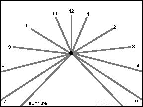 Sunrise is problematical. You can look it up for your area, but it’s not that simple. (Have I said that before?) If you live on a mountaintop, sunrise will come earlier. If you live in a valley – or, in my case, on the west side of the Sierras – it will come later. How much can’t be calculated. It depends on how far west of that hill you are, and how high that hill is, and whether today’s sunrise happens to fall behind your neighbor’s house, or behind that big oak tree. It will come when it will come. Have a straight edge handy and draw a line from the dowel down the center of its shadow, then write down the time. Continue through the day. I try to make a mark every hour on the (solar) hour.