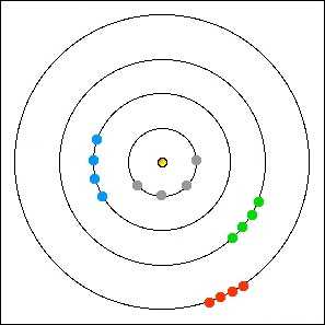 These twin dimensions place the pairs of planet-points at two points on a correctly dimensioned circle, representing the orbit.