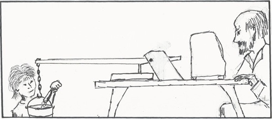 You do it with levers, using the gizmo pictured at the top of the page. I actually built it, and used it all the years I was associated with that event. The lever makes the scale read about 160 pounds when there are 10 pounds in the bucket. That spreads out the difference between two similar weights. The box the adult is staring at is my old Mac SE, with a preprogrammed formula in a database. The formula is: